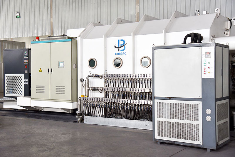 蒸發(fā)系統(tǒng):圓形真空室蒸發(fā)源小車(chē)為開(kāi)出式;方形真空室蒸發(fā)源為固定式。蒸發(fā)源為石墨坩堝電磁感應(yīng)加熱,無(wú)鋁渣濺射、針孔率低,更適合鍍金銀線(xiàn)膜及紗線(xiàn)膜,鍍膜速度快、效率高。